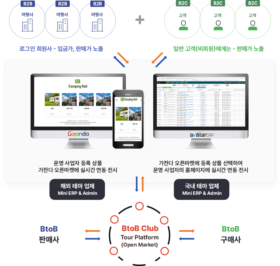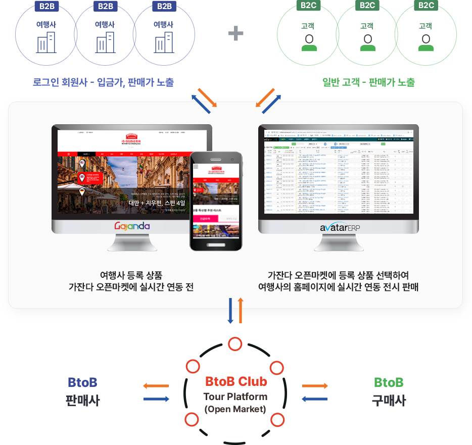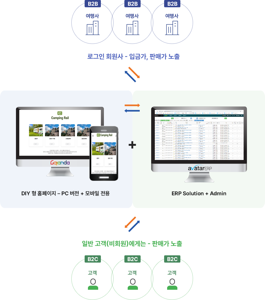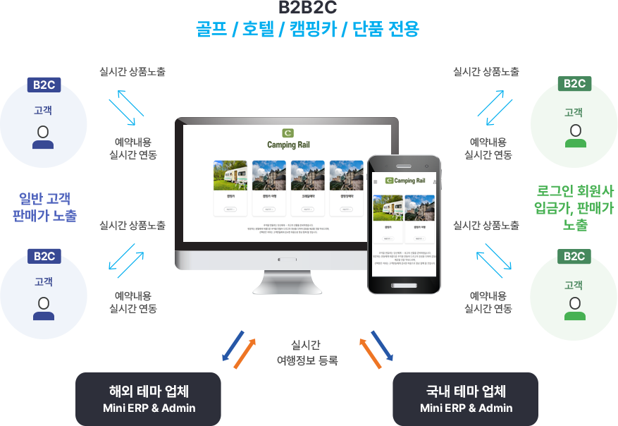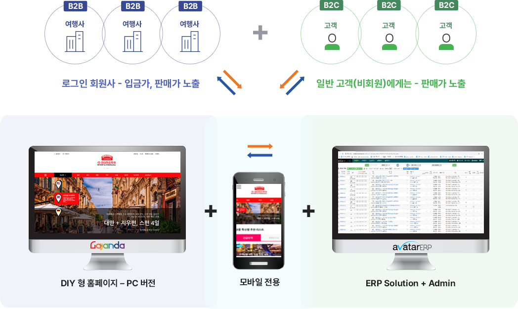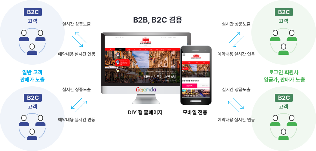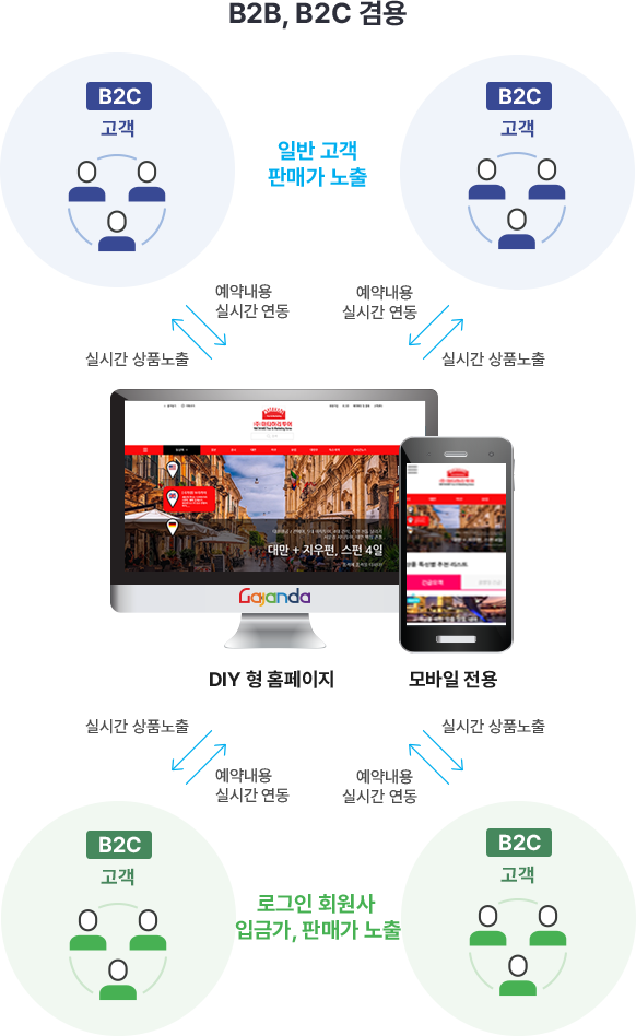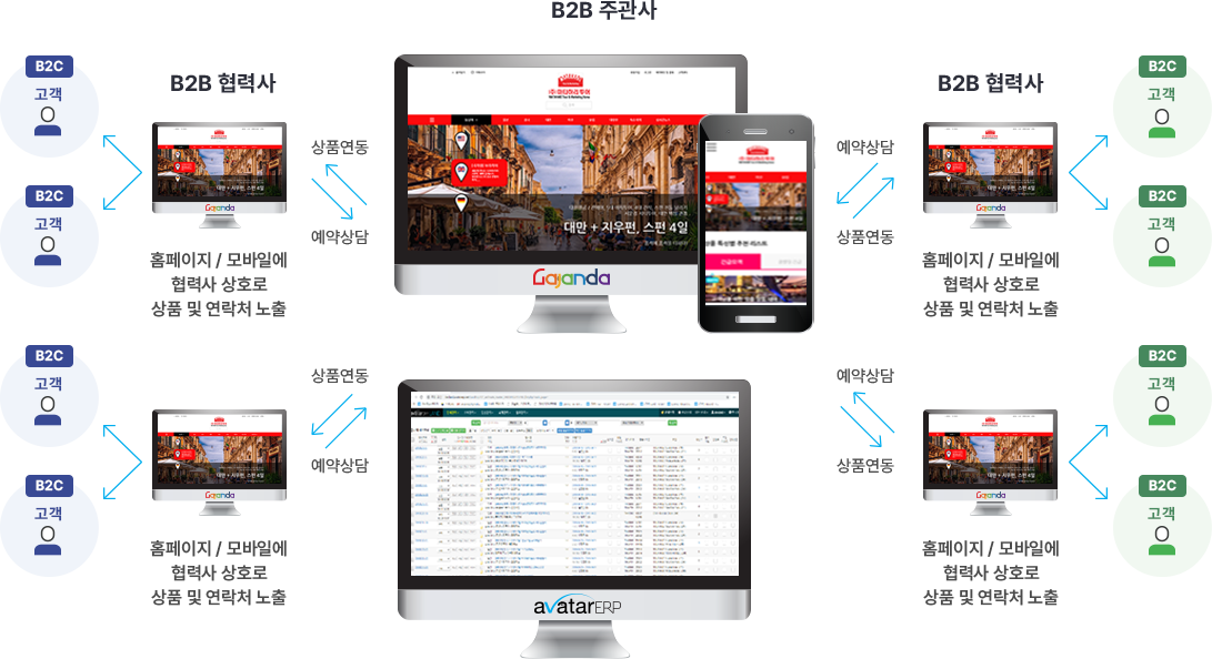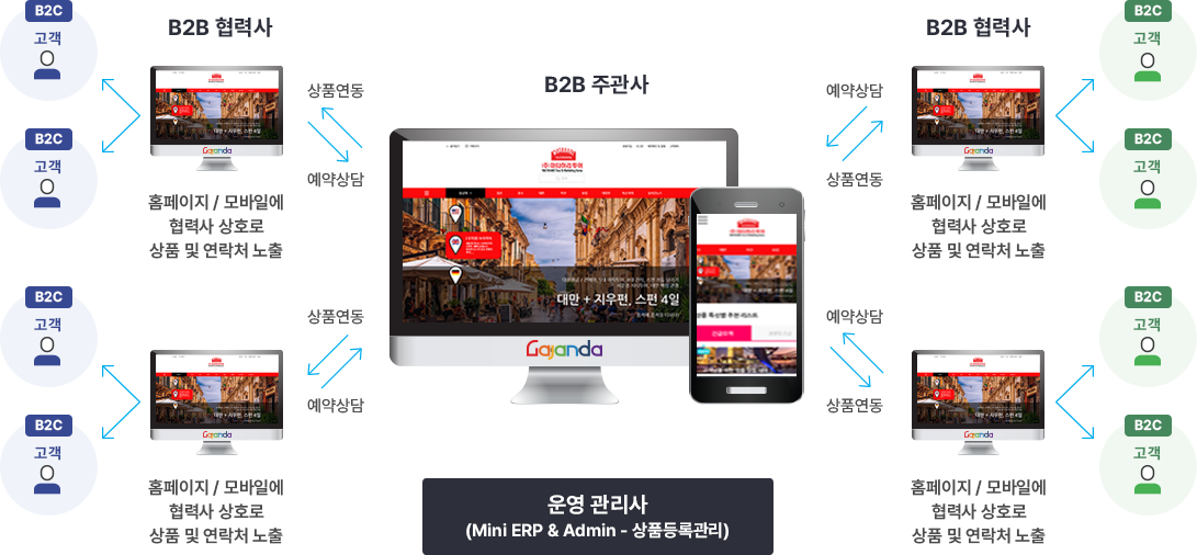 주관 여행사는 자사 홈페이지, 모바일에 여행상품과 여행정보를 등록하고, 협업하는 여행사는 주관사에서 홈페이지 또는 모바일을 분양 받아 주관사가 공급하는 여행상품 및 여행정보을 실시간 연동하여 자사명으로 B2C 판매 할 수 있도록 최적화 되게 개발 된 [분양형] B2B Net Work System 제품 B2B . 영업을 하는 여행사